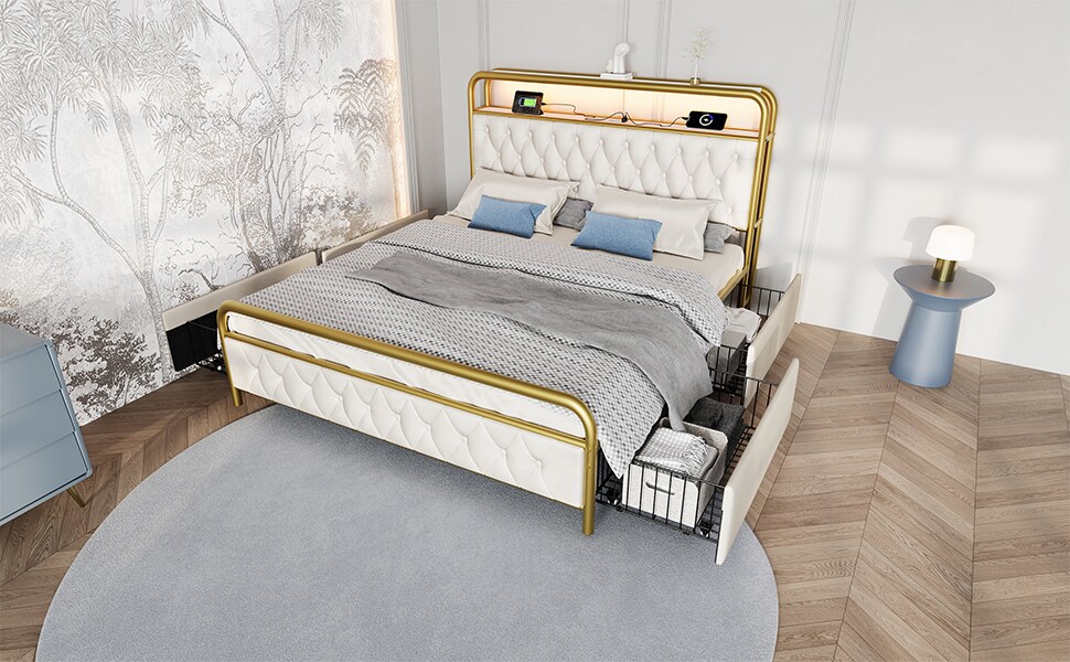 OKWISH Polsterbett 140×200 cm Weiß Samt mit USB-Ladefunktion, LED-Beleuchtung und 4 Schubladen, modernes Schlafzimmerbett mit Stauraum