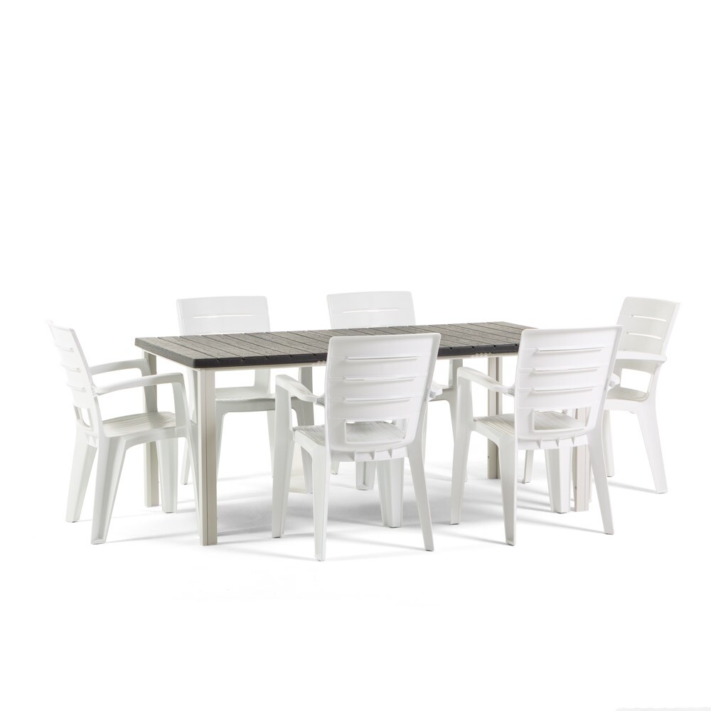 RATTATAN Set aus Tisch und 6 Gartenstühlen, rechteckiger Tisch 180x90cm, Eisenstruktur und Stühle aus Kunststoff mit Armlehnen, stapelbar Thomas+Anita/Schiefer