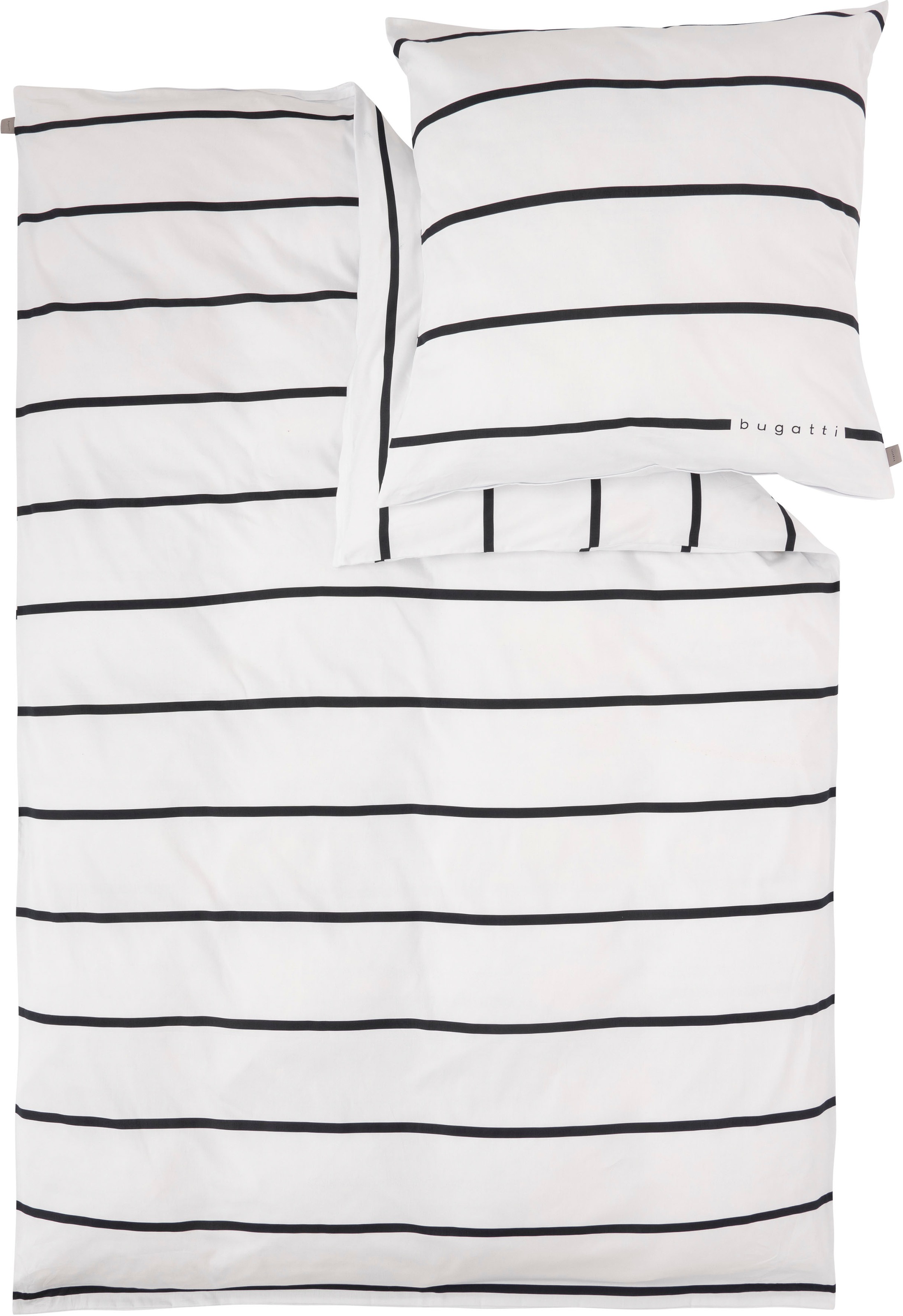 Bettwäsche BUGATTI "Satinbettwäsche bugatti", schwarz-weiß (weiß, schwarz, gestreift), B/L: 155cm x 220cm, , Mako-Satin, B/L: 80cm x 80cm, Mako-Satin, Obermaterial: 100% Baumwolle, Bettwäsche, im zeitlosen Streifenlook