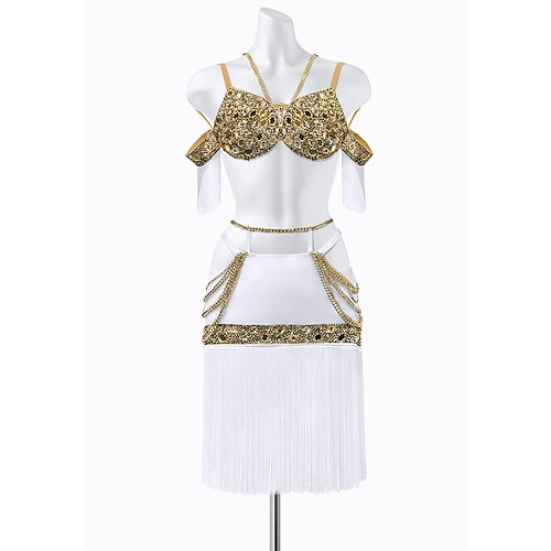 Completo da ballo latino da donna con paillettes in oro bianco: reggiseno con perline, gonna con frange e dettaglio a catena, costume da spettacolo con maniche a spalle scoperte