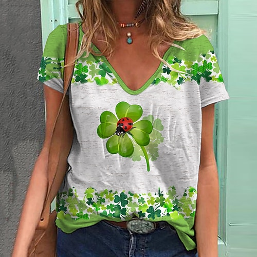 Giorno di San Patrizio Festa di San Patrizio Per donna Maglietta Foglia Giorno di San Patrizio Manica Corta Scollo a V Top Regolari Ferie Weekend Stampato Verde primavera Bianco Avorio Verde chiaro