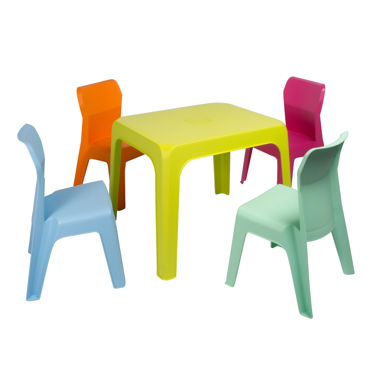 Resol garbar JAN Kinderstuhl-Tisch Indoor, Outdoor Set 4+1 Himmelblau/Fuchsia/Orange/Limettengrün/Aquaminze