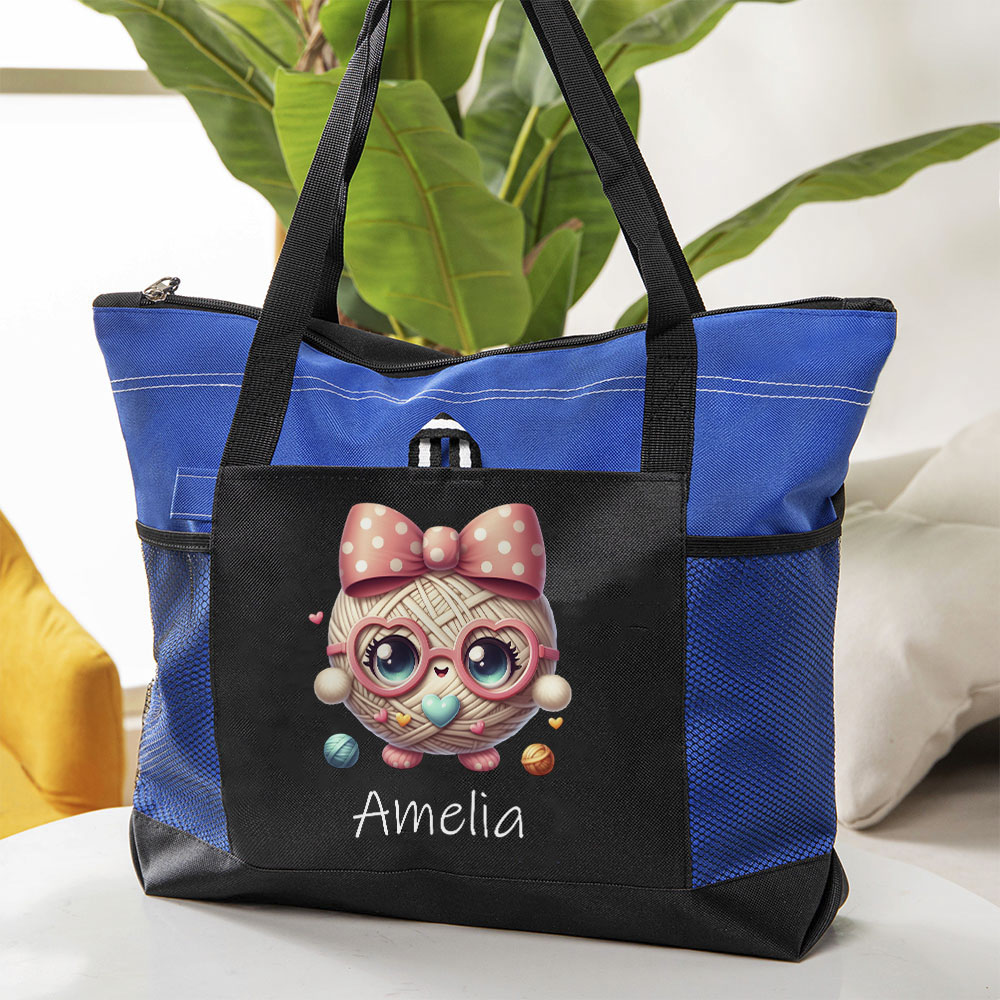 Gepersonaliseerde Schattige Strik Glasgaren Bal Grote Oxford Draagtas met Naam en Mesh Zakken Reisbenodigdheden Verjaardagscadeau voor Haakliefhebbers