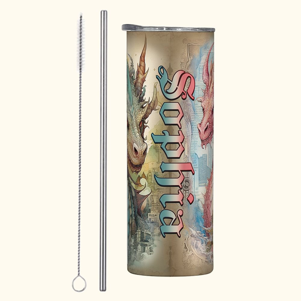 Libro acquerellato personalizzato Dragon 20 oz Skinny Tumbler con cannuccia e spazzola per la pulizia Tazza da caffè da viaggio isolata Regalo per i l