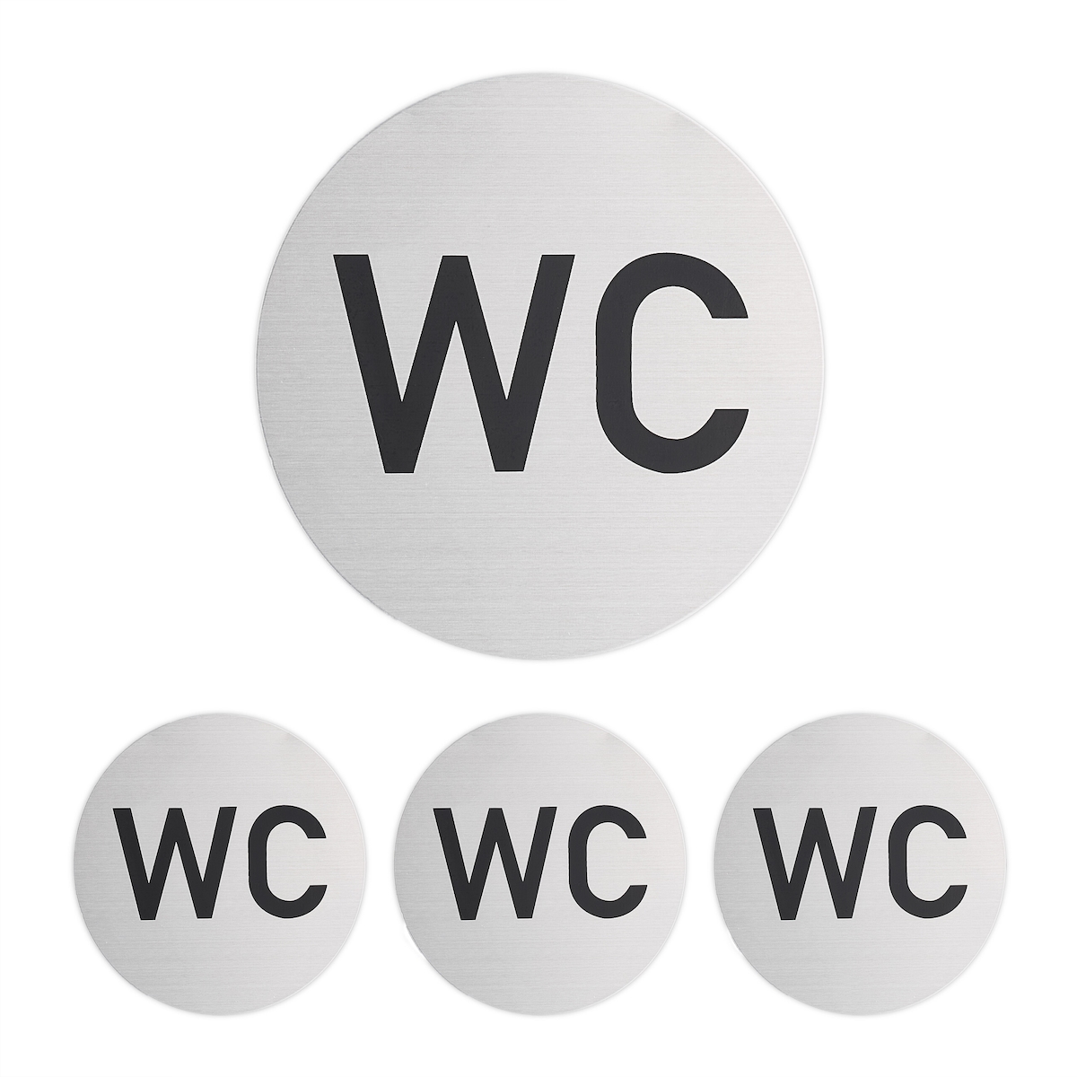 Relaxdays WC Schild, 4er Set, rund, Türschild zum Aufkleben, Ø 10 cm, Bad & Gäste-WC, Aluminium, Toilettenschild, silber