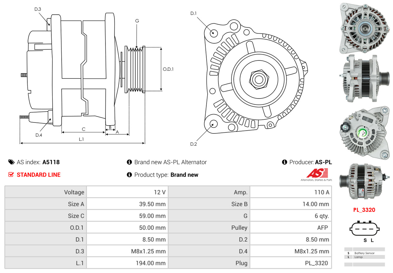 AS-PL Generator A5118 12V 110A für MITSUBISHI NISSAN A002TG0881 A2TJ0281 A002TJ0281