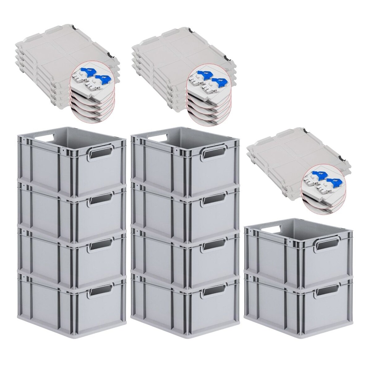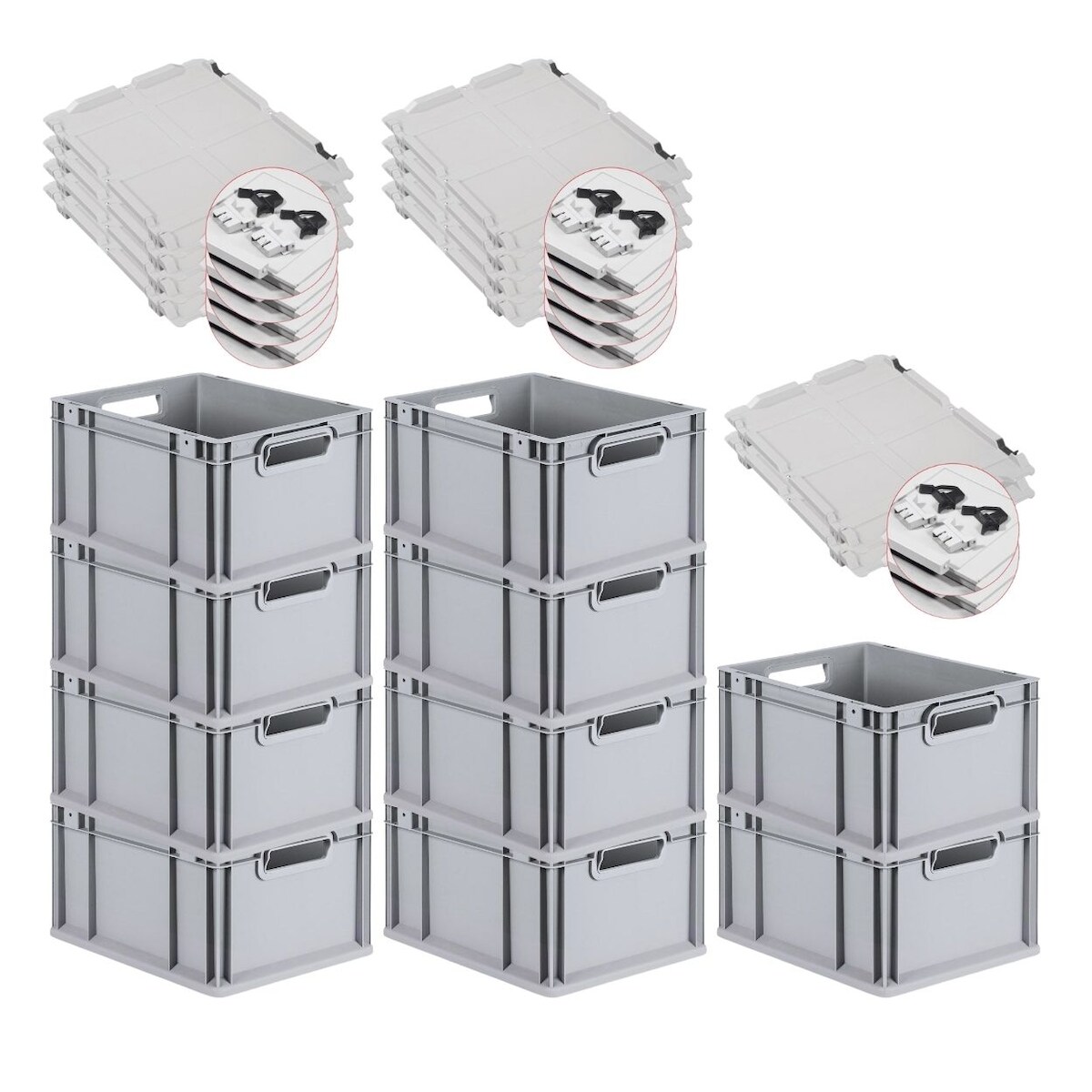 PROREGAL 10x Eurobox NextGen Grip mit Scharnierdeckel & roten Verschlüssen | HxBxT 32x30x40cm | 30 Liter | Griffe offen | Glatter Boden