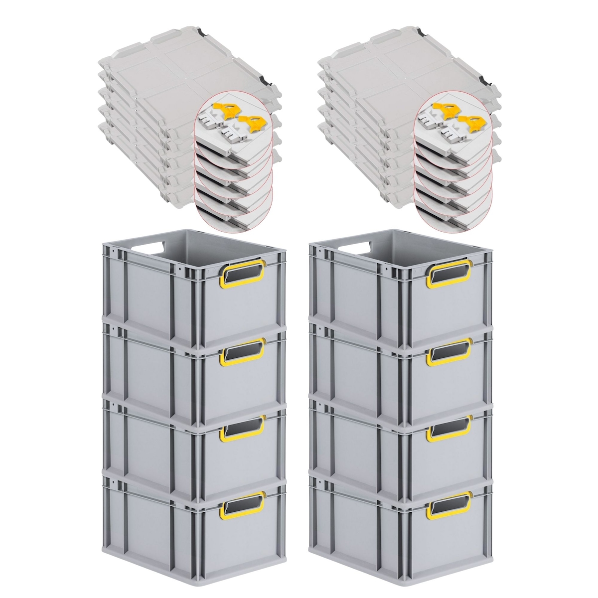 PROREGAL 10x Eurobox NextGen Grip mit Scharnierdeckel & gelben Verschlüssen | HxBxT 22x30x40cm | 20 Liter | Griffe offen | Glatter Boden