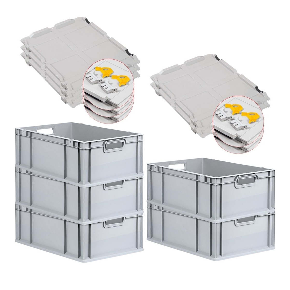 PROREGAL 5x Eurobox NextGen Grip mit Scharnierdeckel & gelben Verschlüssen | HxBxT 22x40x60cm | 44 Liter | Griffe offen | Verstärkter Boden