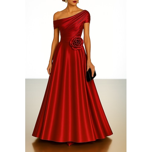 Linea ad A Lunghezza al pavimento Abito da Sera Da principessa Abito formale Elegante Manica Corta Monospalla Matrimonio Formale Raso Elasticizzato con Pieghe