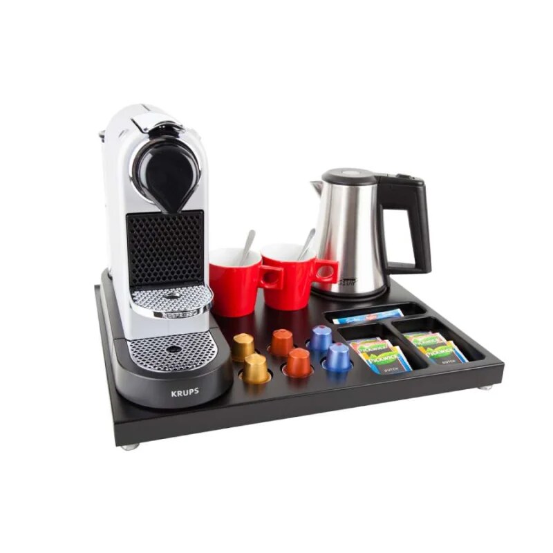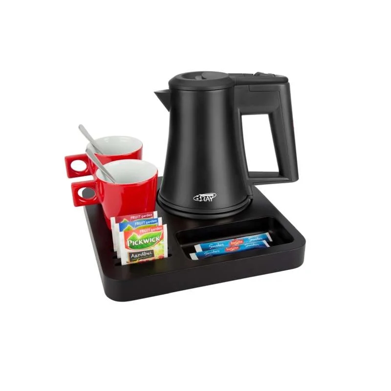 Willkommenstablett SLIM Schwarz mit Wasserkocher STAR 0,5 L Schwarz und 2 rote Porzellantassen