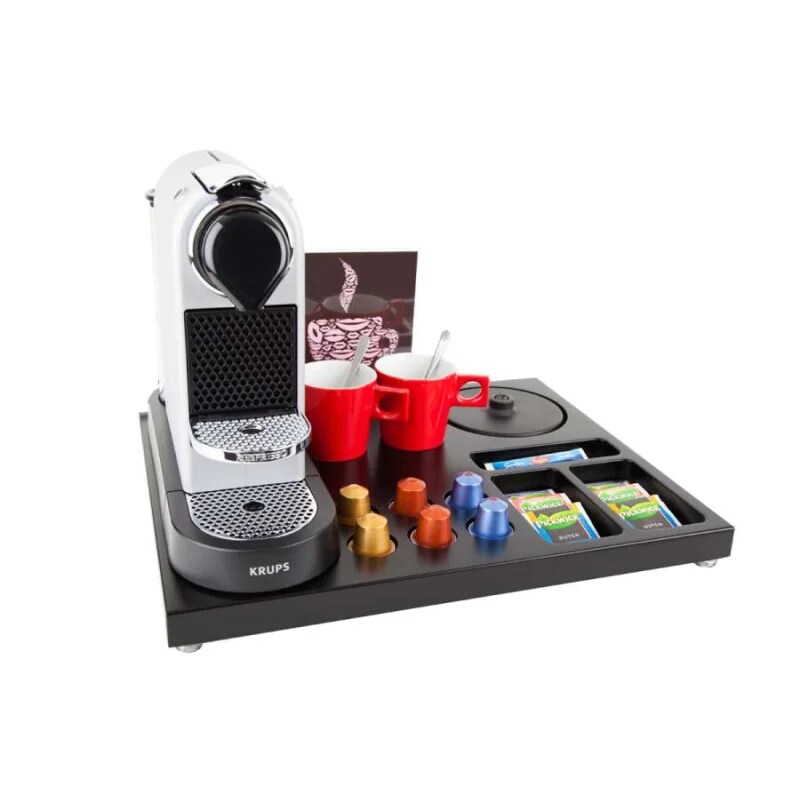 Willkommenstablett SUPREME Schwarz-Braun und 2 rote Porzellantassen mit A5 Prospekthalter