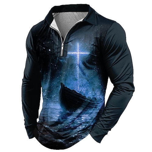 Per uomo Nave Croce Polo Manica Lunga Magliette polo Bavero Vintage Casual Abbigliamento quotidiano Stampa 3D Polo con cerniera a un quarto Primavera Autunno Inverno Giallo Rosso Blu