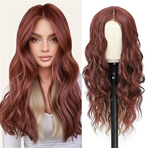 Parrucca in pizzo sintetico Ondulato naturale Stile 26 pollice Nero Riga centrale 13x4 Fronte in Pizzo Parrucca Per donna Parrucca Marrone scuro