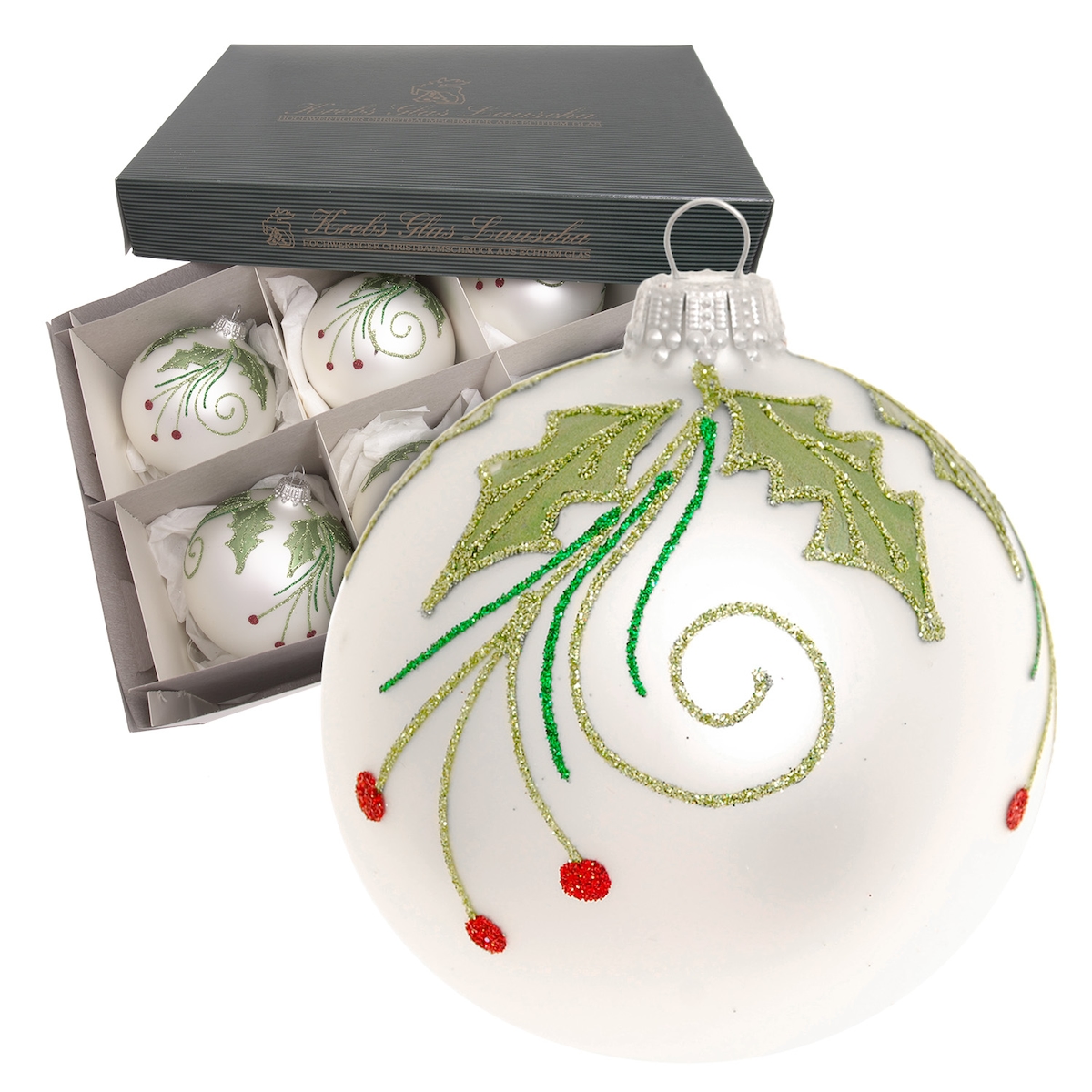 Krebs Glas Lauscha Kugeln Ilex & rote Beeren, Silber Satin, Glitterdekor, 8cm