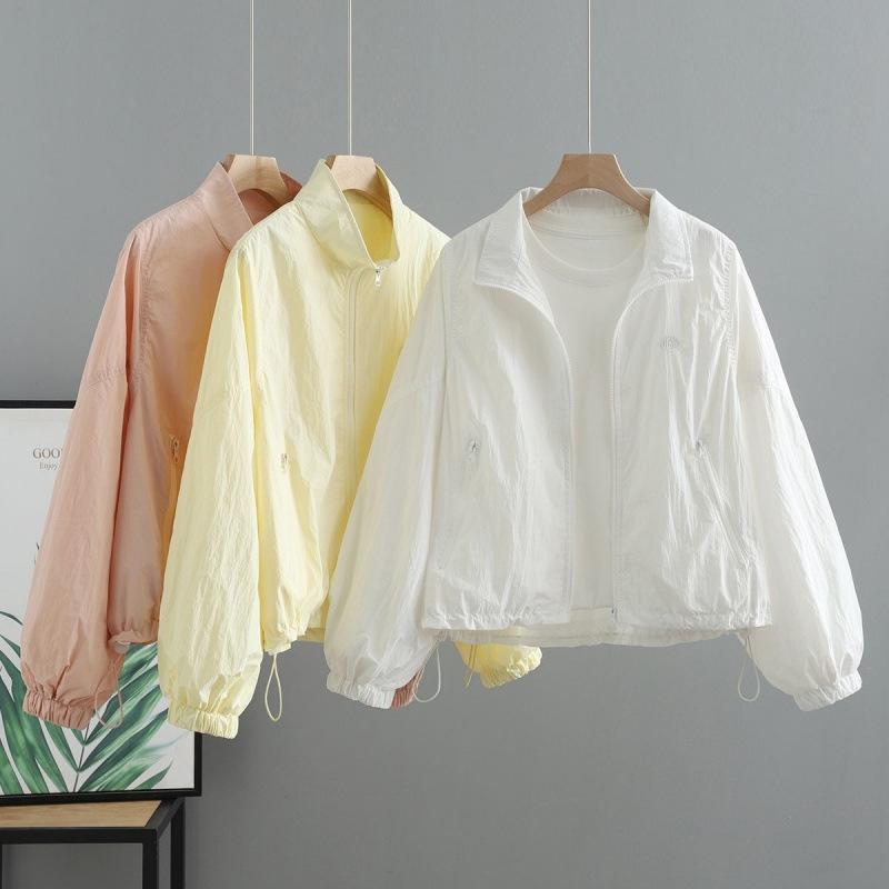 Summer Lightweight Drawstring Sun Protection Jacket Women Short New Suncreen Coat Korean Loose Letter Stand Collar Jacket Top cm white