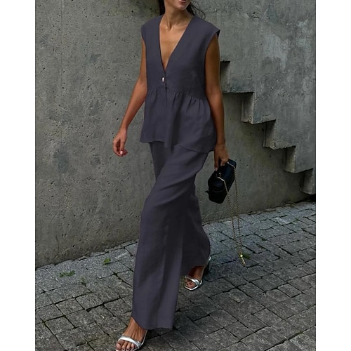 Per donna Elegante Moda Streetwear Misto cotone Set da due pezzi Set di Pantaloni Senza Maniche Scollo a V Tinta unica Coulisse Casuale Quotidiano All'aperto Nero Bianco Rosa Estate Vestibilit