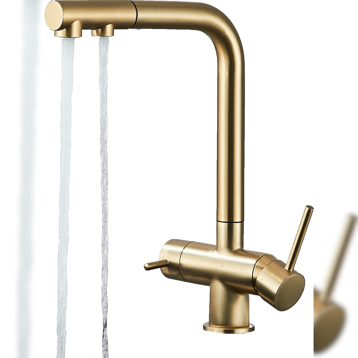 KLARWERK® Felix | ausziehbare 3-Wege Armatur Edelstahl Gold matt | Filter Trinkwasser Wasserhahn Küche | Osmose Mischbatterie L-Auslauf 3 Anschlüsse
