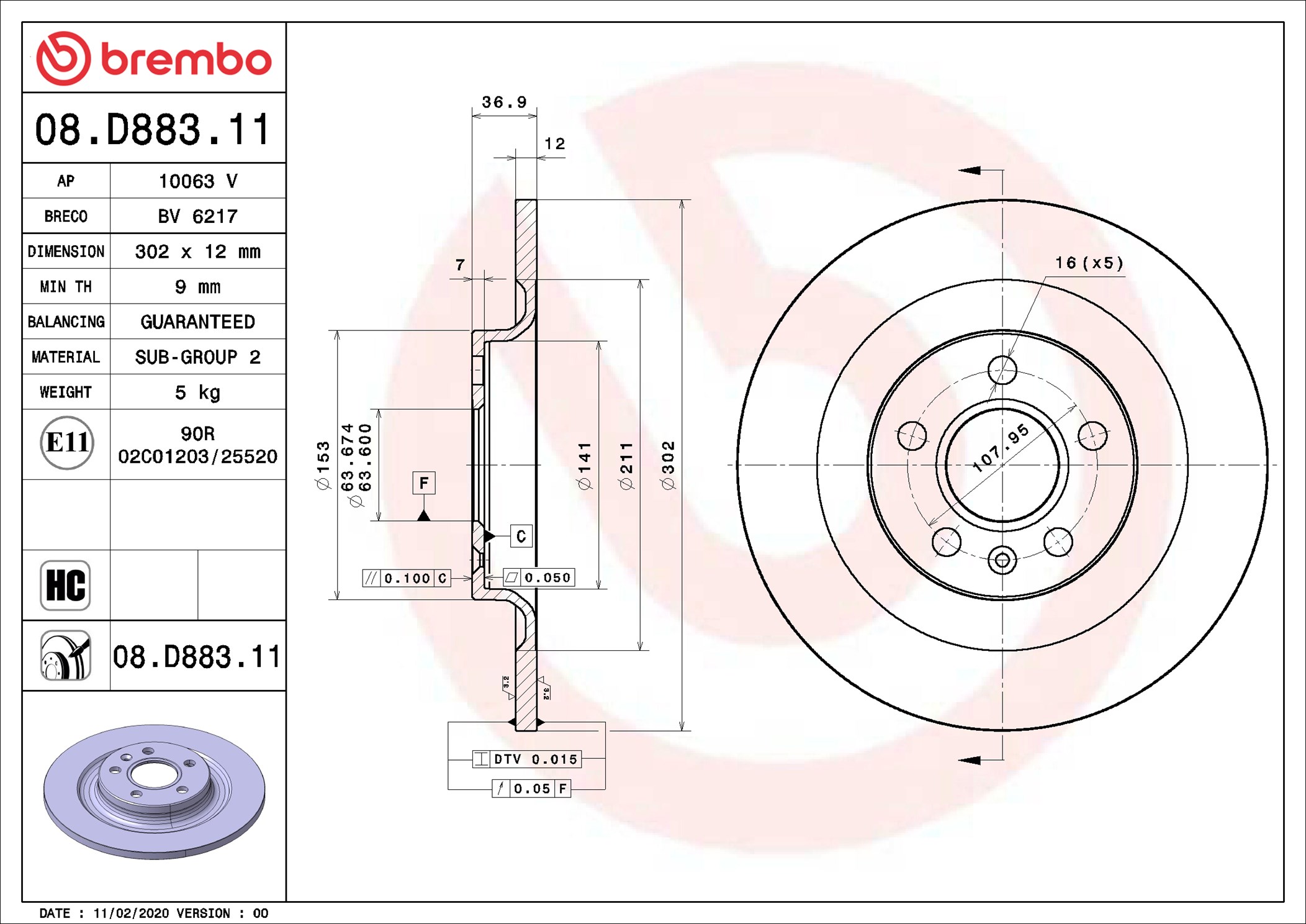BREMBO Bremsscheibe 08.D883.11 hinten rechts links voll 302mm für VOLVO ASIA LYNK & CO GEELY 8888221970 31471477 8890801400