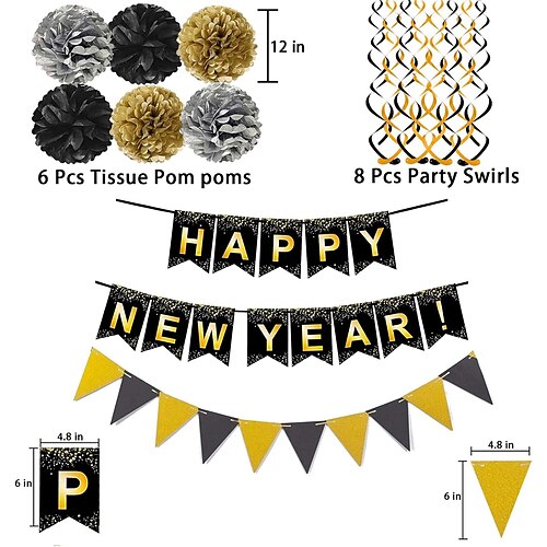 decorazioni nere e oro per la festa di capodanno, set di striscioni di buon anno – bandierine di carta nere e oro con festoni a spirale per la decorazione della festa del conto alla rovescia del 2026