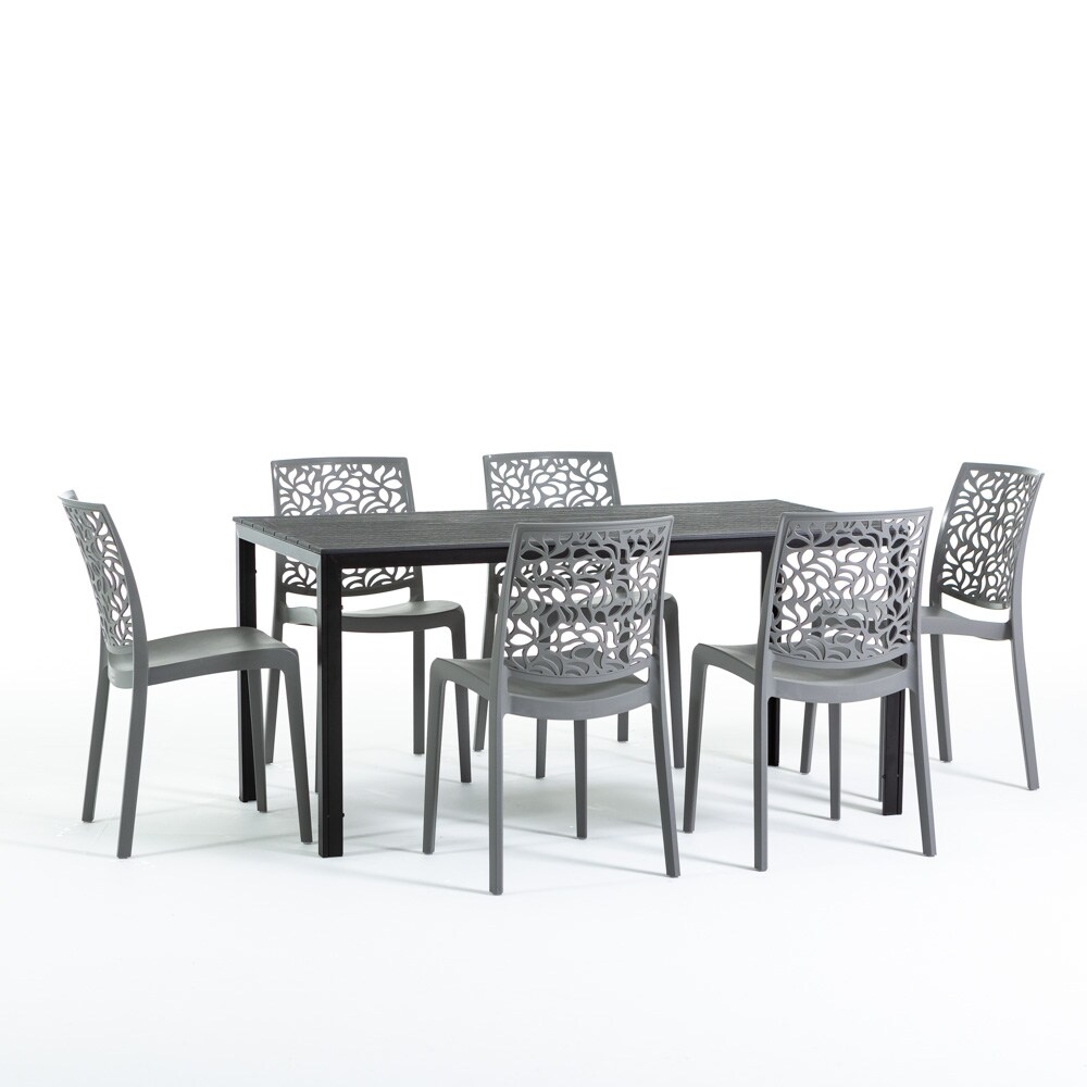 RATTATAN Gartenset mit Tisch und 6 Stühlen, rechteckiger Tisch mit Eisenstruktur und einteilige, stapelbare Stühle aus Harz – Thomas+Anna/Grau-Schwarz