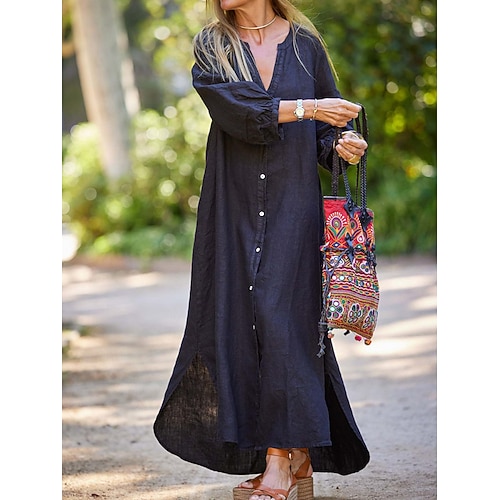 Per donna Nero Bianco Grigio Estate Primavera Abito maxi Abito Bianco Abiti in cotone e lino Abito Camicia Essenziale Casual Quotidiano Vacanza Vestibilità comoda Semplice Scollo a V