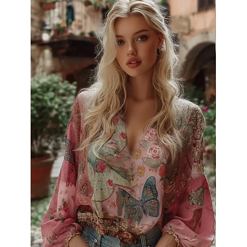 Per donna Camicia Floreale Elegante Bohemien Vintage Manica Lunga Scollo a V Top Regolari Quotidiano Ferie Patchwork Stampato Rosa Estate Primavera
