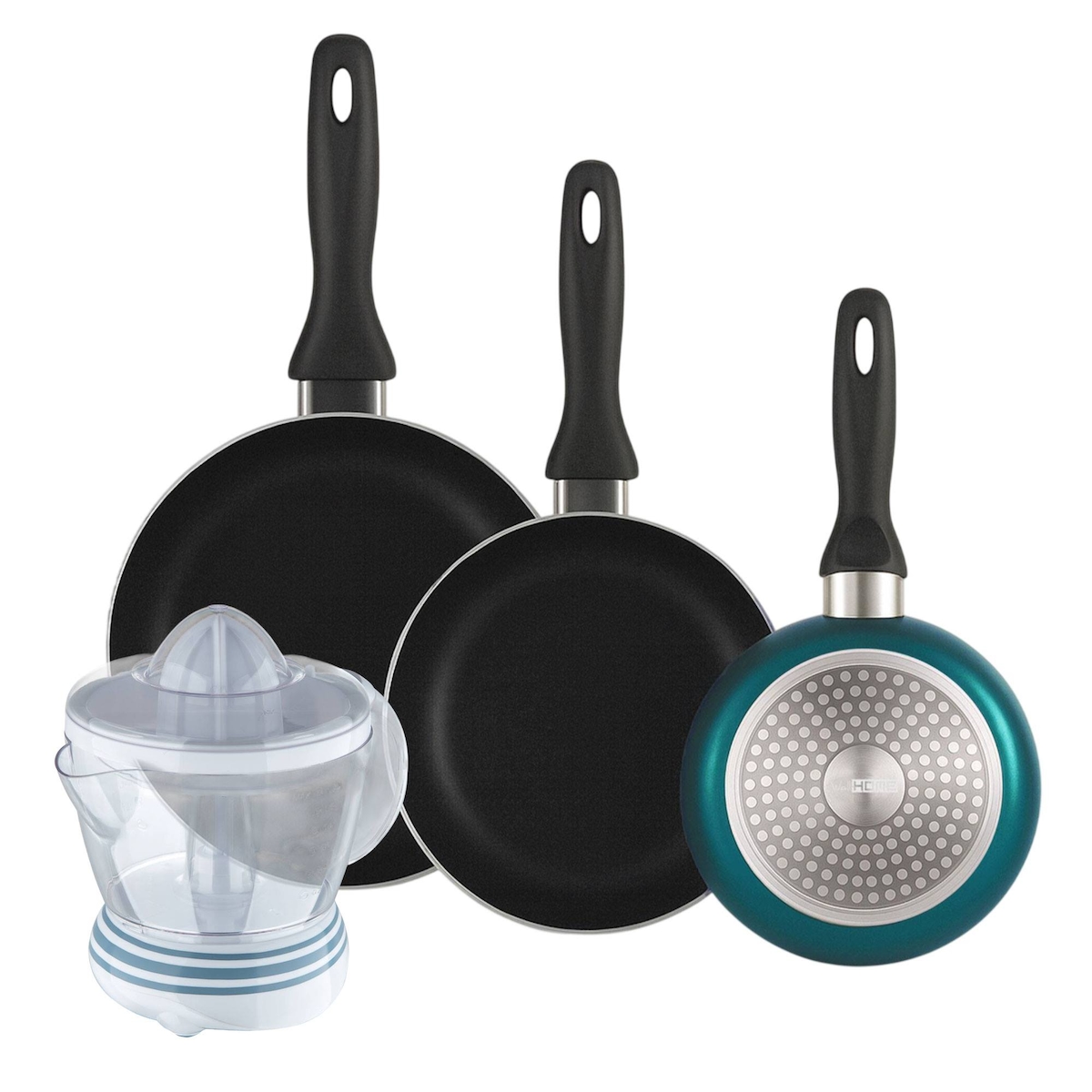 BERGNER - Set aus 3 Pfannen Ø16/20/24cm aus gepresstem Aluminium in metallic-blau mit Entsafter NATURALLY 40 W, 1,2 L