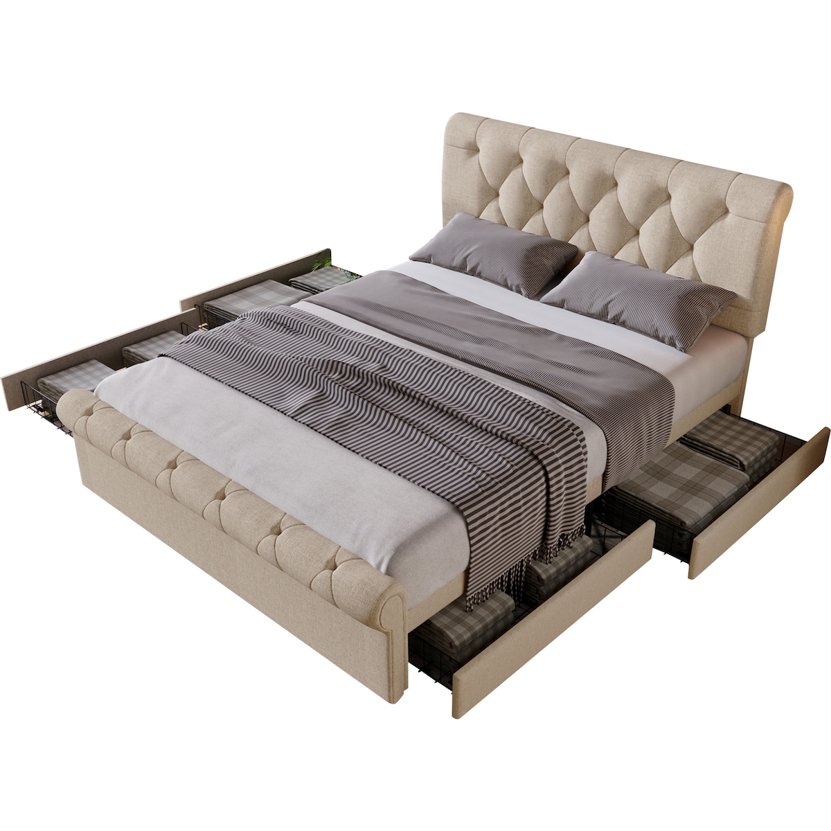 OKWISH Polsterbett 140x200 cm mit 4 Schubladen und Höhenverstellbarem Kopfteil – elegantes Chesterfield Design in Natur