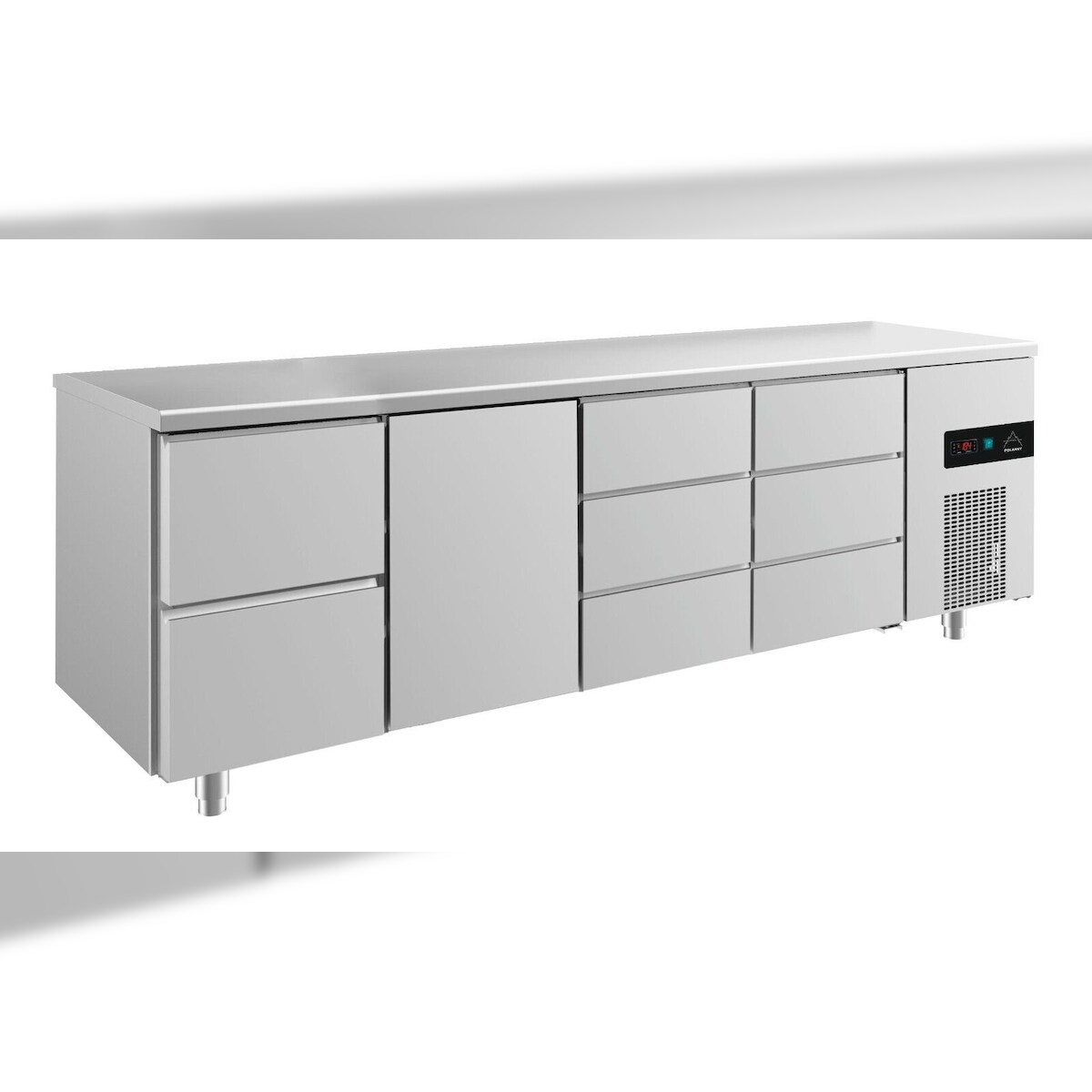 Gastro Kühltisch 1 Tür (Mitte) 8 Schubladen (rechts, Mitte, links) Umluftkühlung 2330x700x850mm -2/+8°C Edelstahl