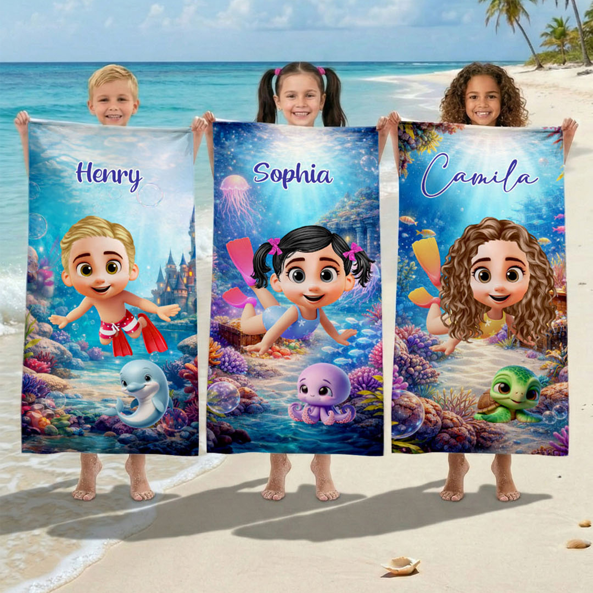 Serviette de plage personnalisée avec personnage de plongée 3D et nom - Microfibre à séchage rapide - Cadeau d’anniversaire pour enfant et adulte