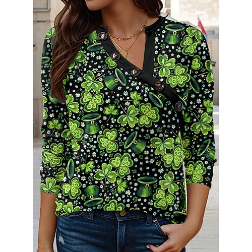 Maglietta Donna St. Patrick's Day Fortunata Shamrock Casual Maniche Lunghe V Collo Top Regolari Stampa Bottoni Quotidiana Verde Primavera Autunno