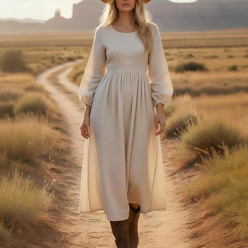 Per donna Abito Midi Abito in cotone e lino Moda Moderno Quotidiano Vacanza Uscire Vestibilità regolare Semplice Manica Lunga Girocollo Cachi Estate Primavera