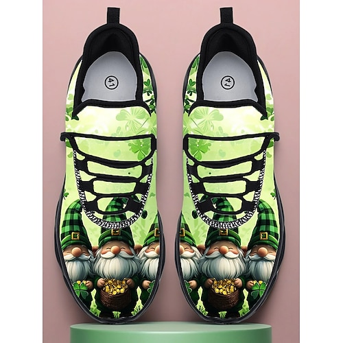scarpe da uomo per il giorno di San Patrizio: design verde e viola con dettagli di gnomi e trifogli, ideali per eventi festivi e sfilate
