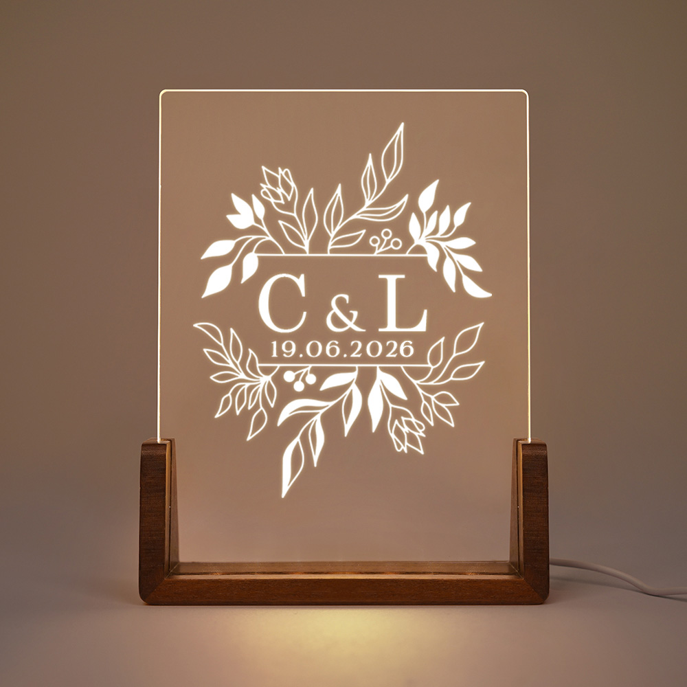 Veilleuse LED Monogramme Floral Personnalisé avec Nom Date et Base en Bois Décoration d'Intérieur Saint Valentin Cadeau de Mariage pour Couple
