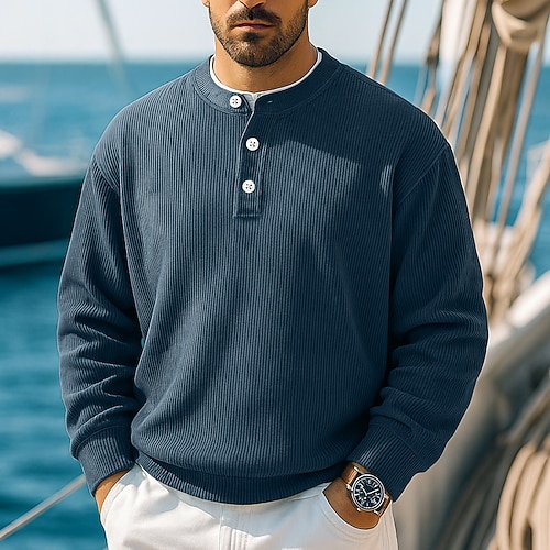 Per uomo Top a Maglia a Coste Testurizzato Streetwear Casuale Bavero Manica Lunga Essenziale Moderno Semplice Bottoni Primavera Autunno Tutte le stagioni Vestibilità aderente Blu Bianco Blu marino