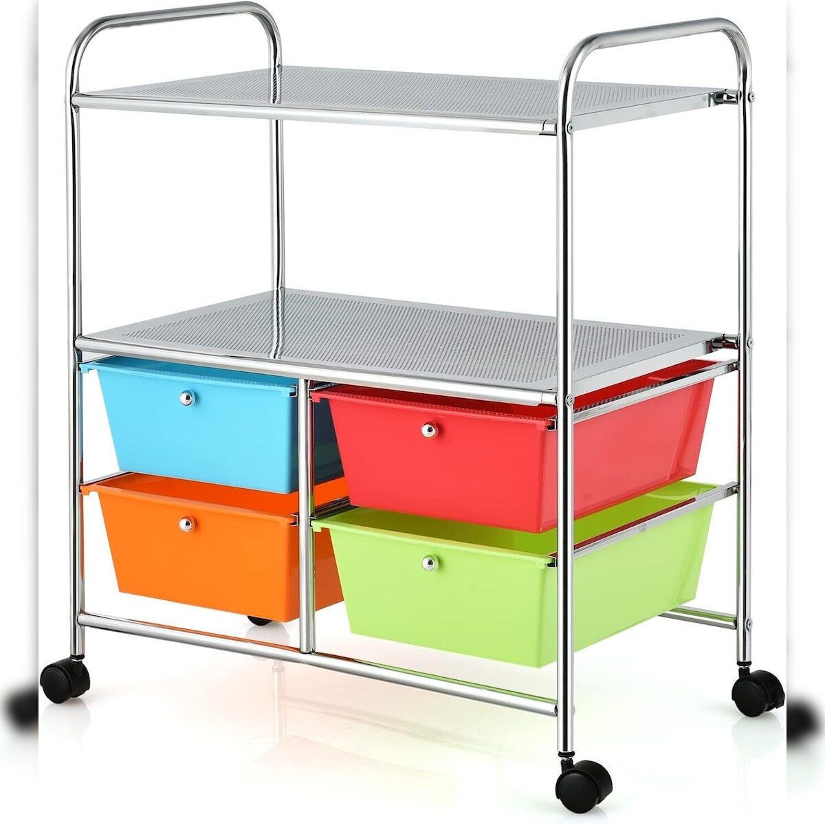 COSTWAY Rollwagen mit 4 stapelbaren Schubladen, Schubladenwagen, Rollcontainer mit Metallrahmen und Regalen
