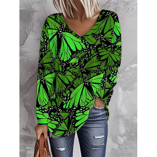 Per donna Maglietta Grafico Farfalla Vintage Elegante Casual Manica Lunga Scollo a V Top Regolari Quotidiano Stampato Blu Viola Arancione Verde Primavera Autunno