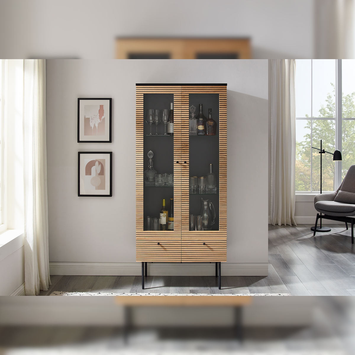 SalesFever Glasvitrine 2-türig|Vitrine mit 4 Einlegeböden und 2 Schubladen, MDF Eiche Echtholzfurnier, Gestell Metall, B79xT43xH179cm