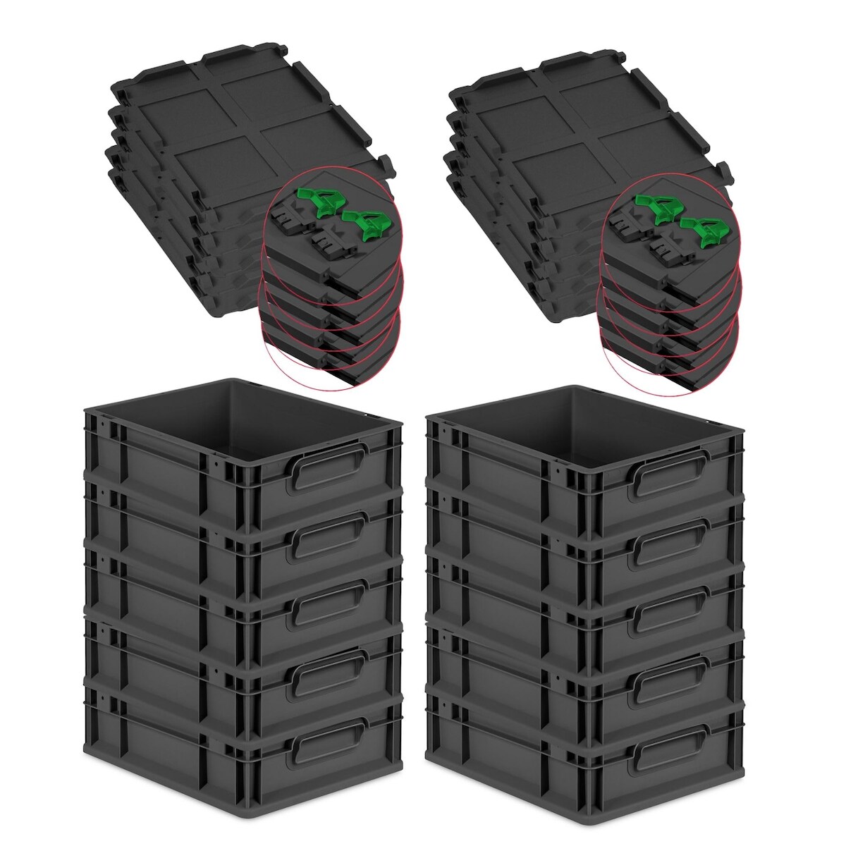 PROREGAL SuperSparSet 10x Eurobox NextGen Grip mit Scharnierdeckel & grünen Verschlüssen, HxBxT 12x30x40cm, 11L, Schwarz, Griffe zu, Eurobehälter