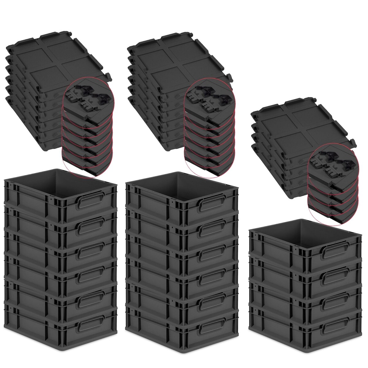 PROREGAL SuperSparSet 16x Eurobox NextGen Grip mit Scharnierdeckel & schwarzen Verschlüssen, HxBxT 12x30x40cm, 11L, Schwarz, Griffe offen, Box