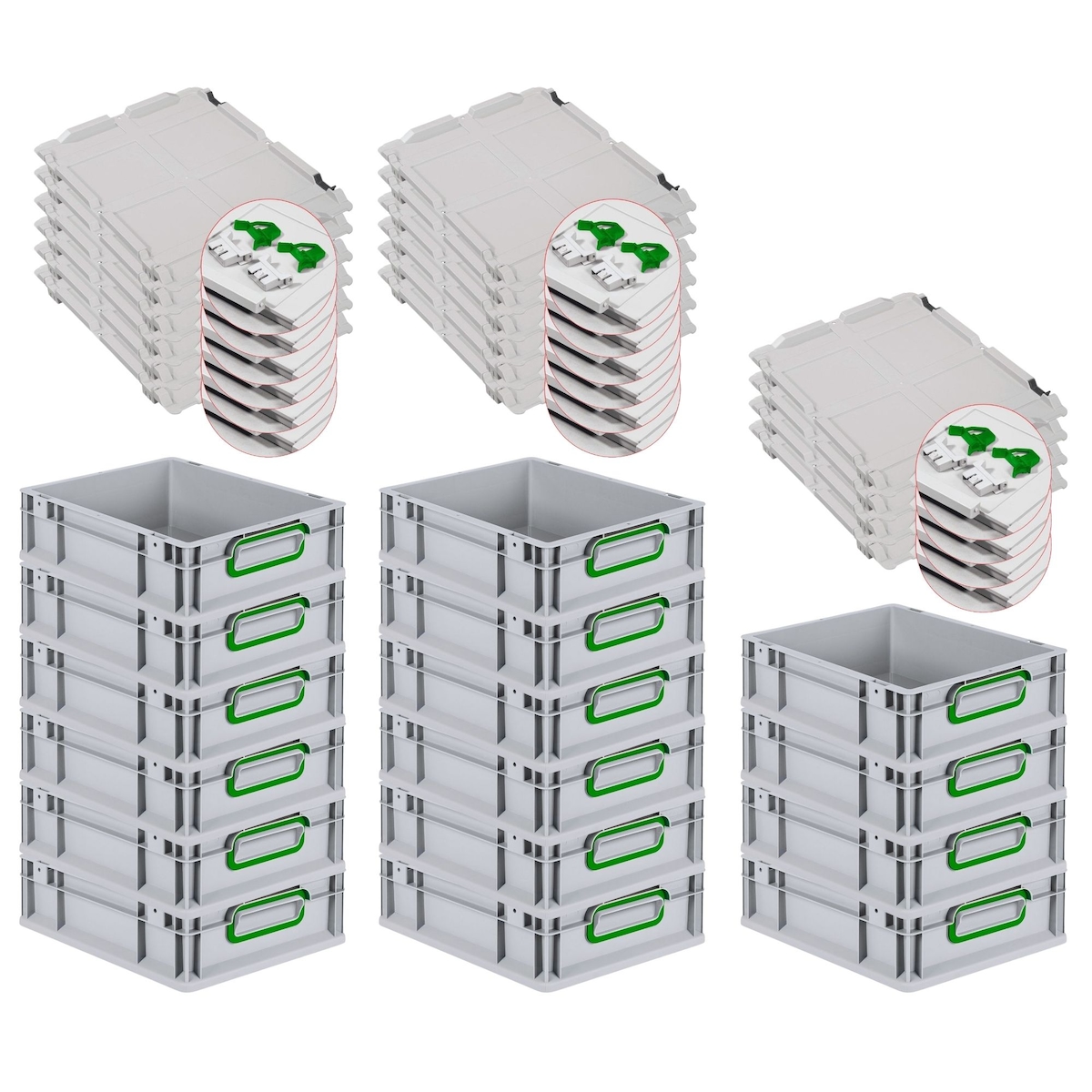 PROREGAL 16x Eurobox NextGen Color mit Scharnierdeckel & Verschlüssen | HxBxT 12x30x40cm | 11 Liter | Griffe grün geschlossen | Glatter Boden