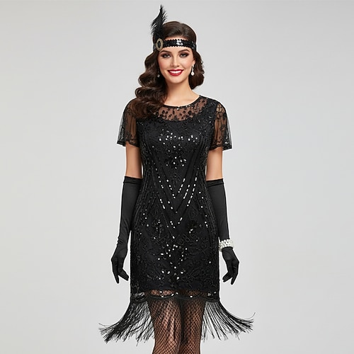Set Retrò Vintage Anni Ruggenti Anni 1920 Lunghezza al ginocchio Abito Flapper Abiti Set di accessori con accessori Maniche corte Il grande Gatsby Invitato al matrimonio Paillettes Frangia con nappe