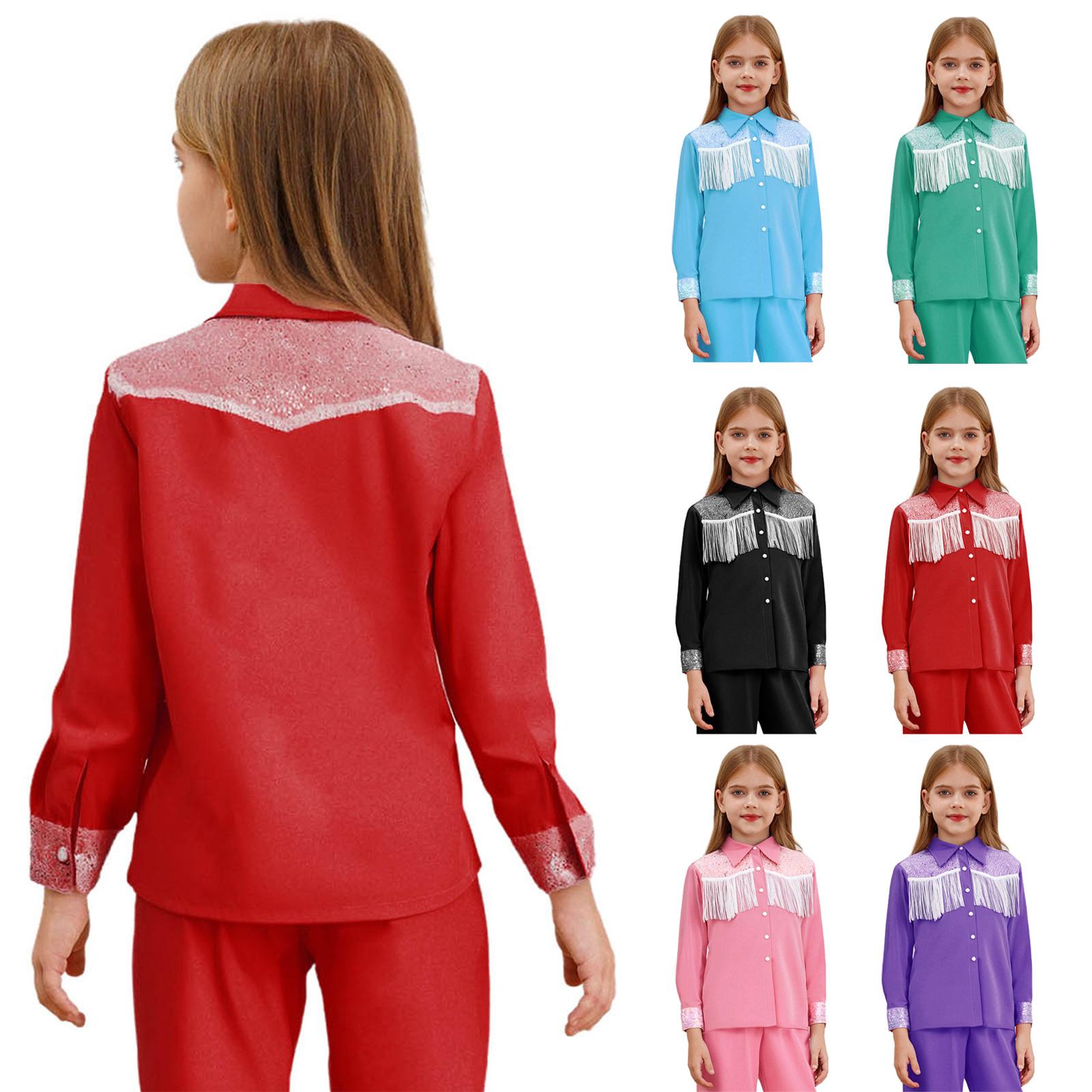 Girls Western Cowgirl Costume Lapel Long Sleeves Button Down Shirt Shiny Sequins Fringe Design Dress Up Shirt cm blue