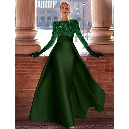 Linea ad A Lunghezza al pavimento Abito da Sera Elegante Scintillante Setoso Manica Lunga Collo gioiello Natale Formale Raso con Glitter Spacco