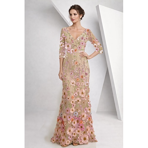 Linea ad A Lunghezza al pavimento Abito da cerimonia per signora Mezza Manica Scollo a V Elegante Vintage Formale Pizzo Tulle con Fiori 3D Ricamo Fiore