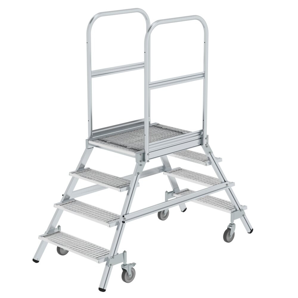 PROREGAL Podesttreppe beidseitig begehbar mit Federrollen | Stahl-Gitterrost | 4 Stufen | Rutschsichere Leiterschuhe