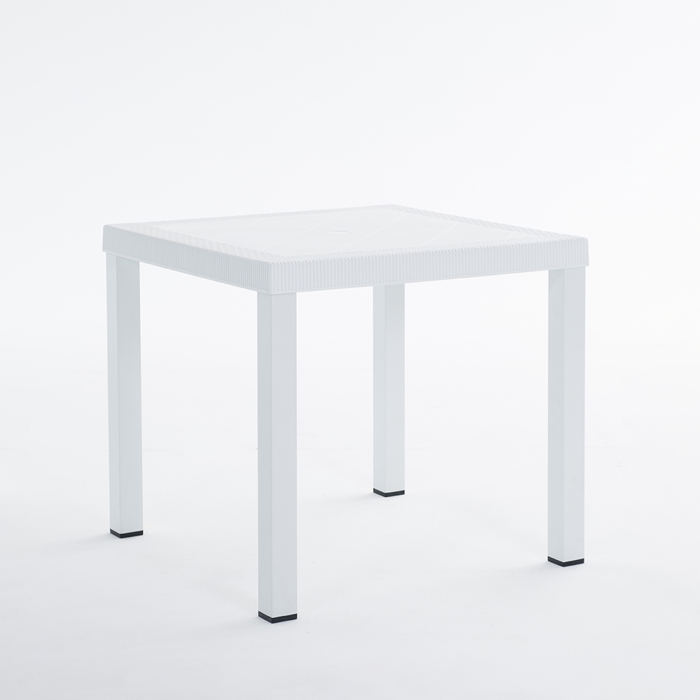 RATTATAN Tisch RAUL 82x82 cm aus Aluminium und Polypropylen, stabil und modern, mit Rand in Rattanoptik und Sonnenschirmloch – Weiß