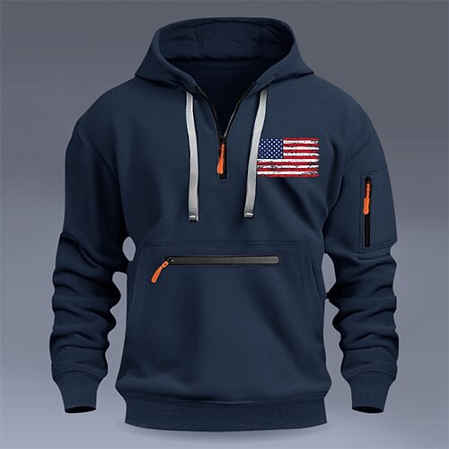 Per uomo Felpa con cappuccio Maglione Felpa con cappuccio e zip corta Blu Nero Vino Blu marino Cammello Con Cappuccio Bandiera Americana Tasca Stampato Quotidiano Sport Outdoor Sportivo Streetwear
