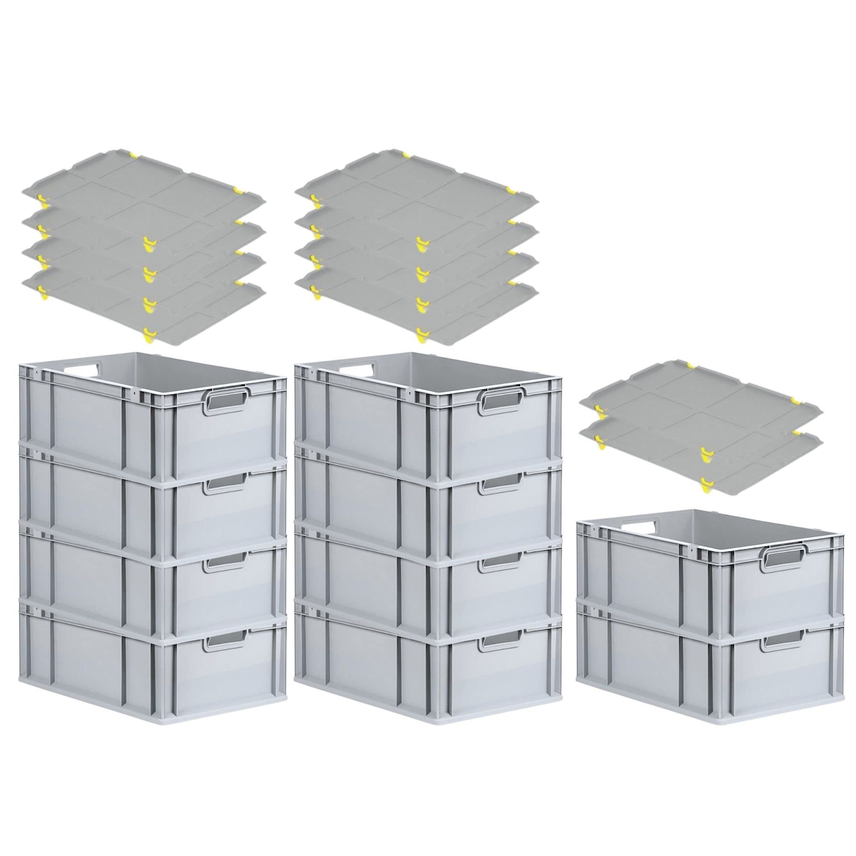 PROREGAL SparSet 10x Eurobox NextGen Economy mit Auflagedeckel & 4x Verschlüsse Gelb, Griffe offen, HxBxT 22x40x60cm, 44L, Eurobehälter, Box